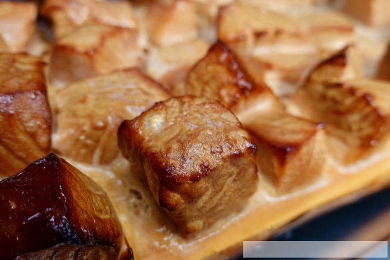 - Snij de zalm in blokjes (snij een maat, zodat je een stukje in 1x in je mond kunt stoppen) en marineer de zalm bij voorkeur een uurtje of 3 voordat je de zalm maakt