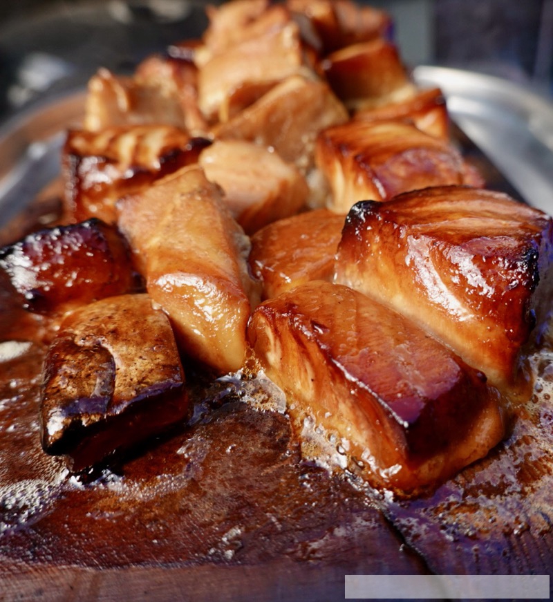 - Als de zalm bonbons klaar zijn, dan kun je ze op de rookplank laten liggen en hou je de rookplank met vuurvaste handschoenen vast bij het uitserveren; je kunt ze ook even op een andere plank leggen om uit te delen.