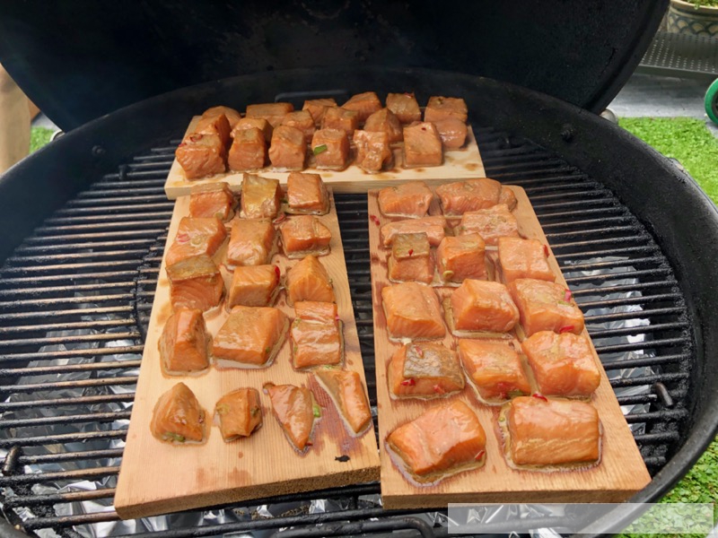 - Neem nu de zalm uit de marinade en leg de blokjes op een rookplankje (leg dat niet in het water vooraf: we gaan roken, niet stomen).