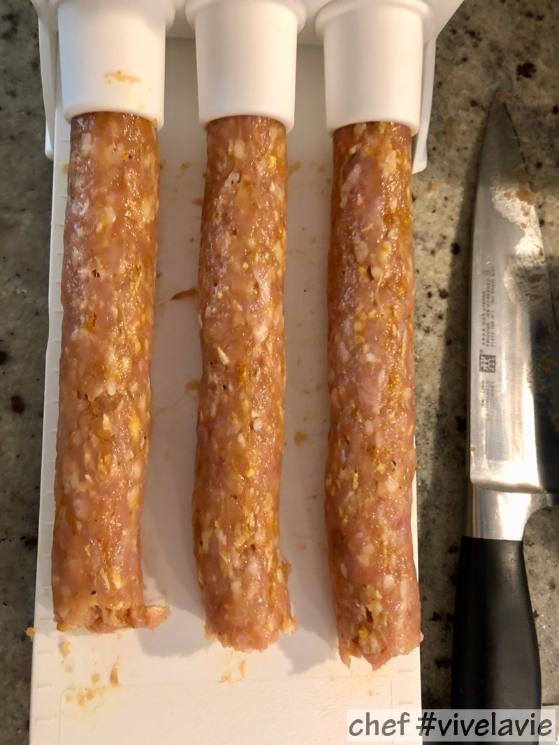 - Maak nu de spiezen: ik heb een krokettenmaker, dus daar kun je perfecte spiezen mee maken, maar met de hand kneden kan natuurlijk ook: weeg ongeveer 50gr af, maak hier balletjes van en rol ze vervolgens uit tot een worstje; steek vervolgens de sereh stengel erin (of de satéprikker)